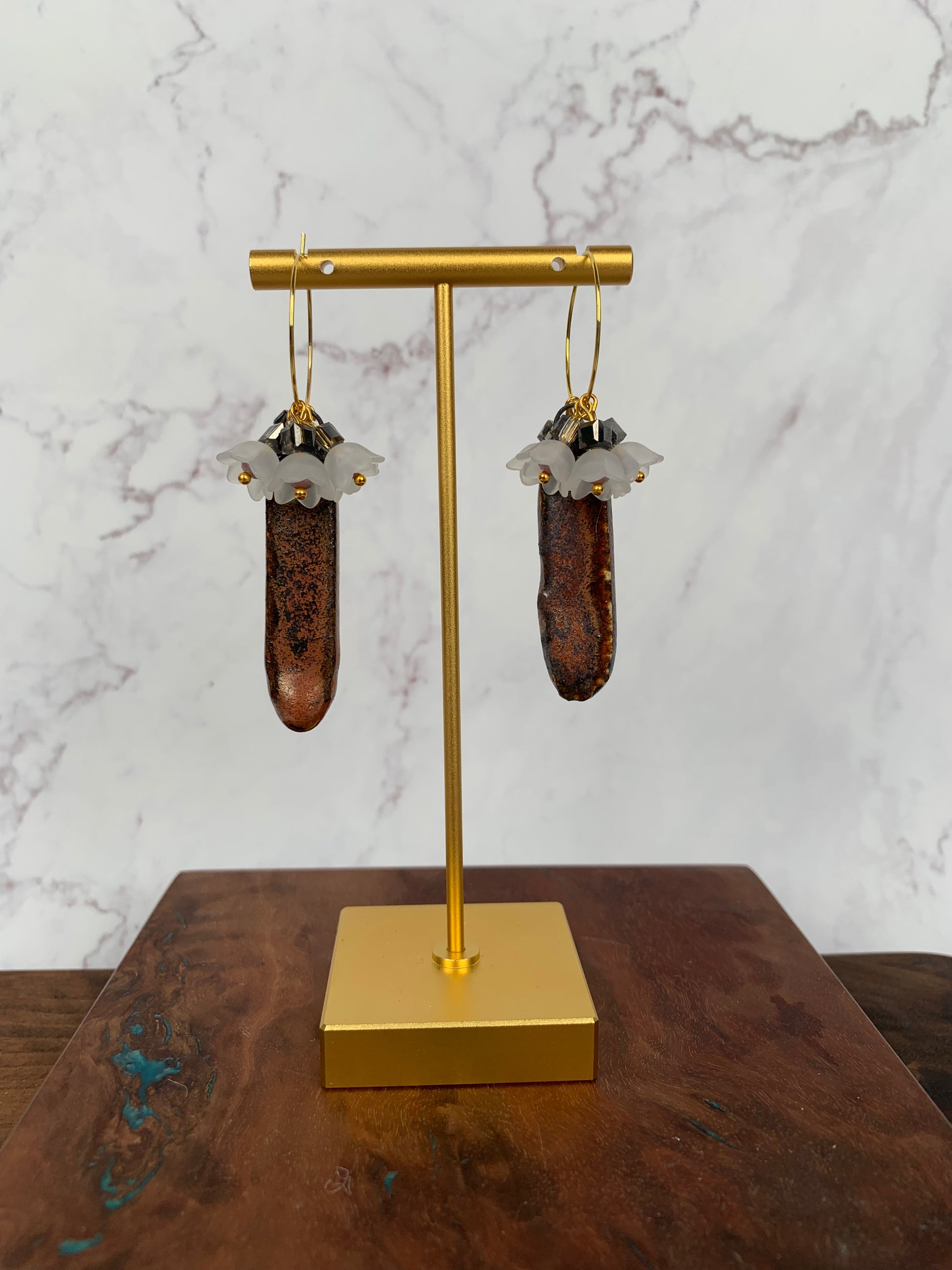 Copper porcelain hoop earrings with white lily of the valley accents.