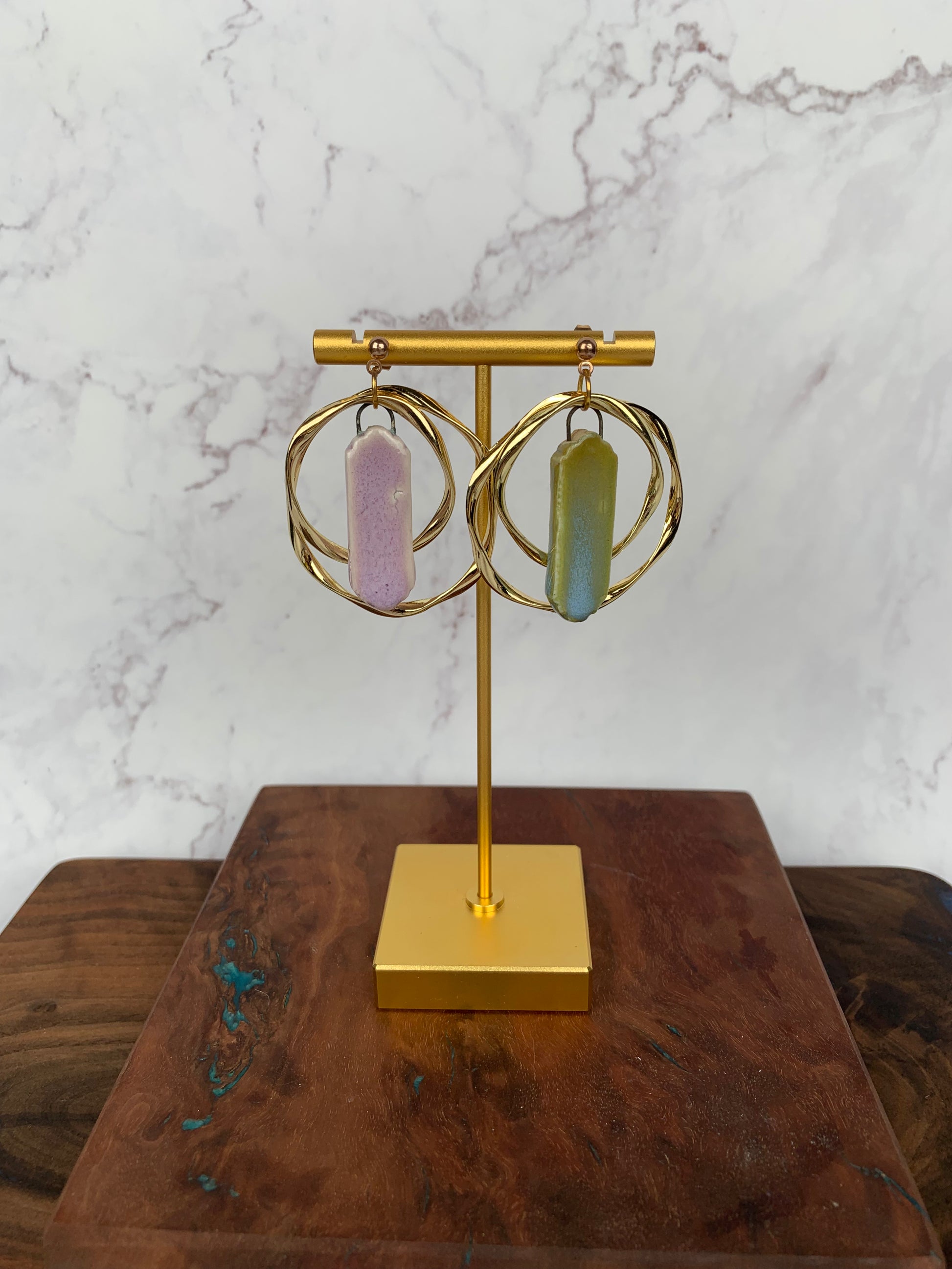 One pink porcelain dangle earring with gold toned circle accents and one green porcelain dangle earring with gold toned circle accents.